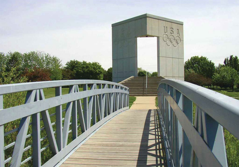 A six-foot-wide pedestrian bridge across a drainage swale that divides the Olympic Tribute from the rest of the park activities. The bridge allows easy access for pedestrians walking through the park or fans that are visiting sporting events within the park.