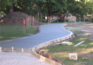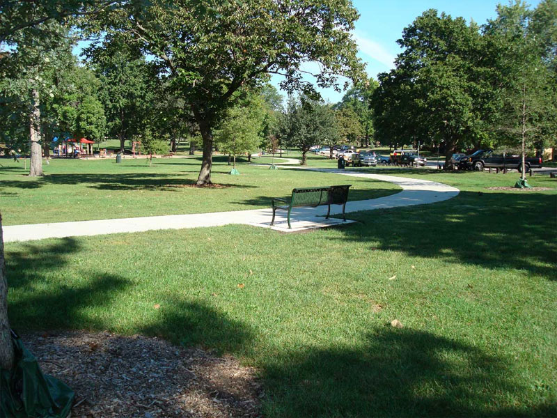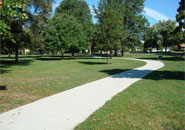 An eight-foot-wide concrete trailway with six access points and brass distance markers in the pavement every tenth of a mile. The trail provides enough room for joggers and walkers to share within the comfort and safety of a beautiful park.
