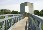 A six-foot-wide pedestrian bridge across a drainage swale that divides the Olympic Tribute from the rest of the park activities. The bridge allows easy access for pedestrians walking through the park or fans that are visiting sporting events within the park.