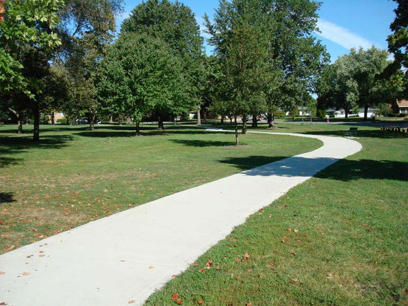 An eight-foot-wide concrete trailway with six access points and brass distance markers in the pavement every tenth of a mile. The trail provides enough room for joggers and walkers to share within the comfort and safety of a beautiful park.